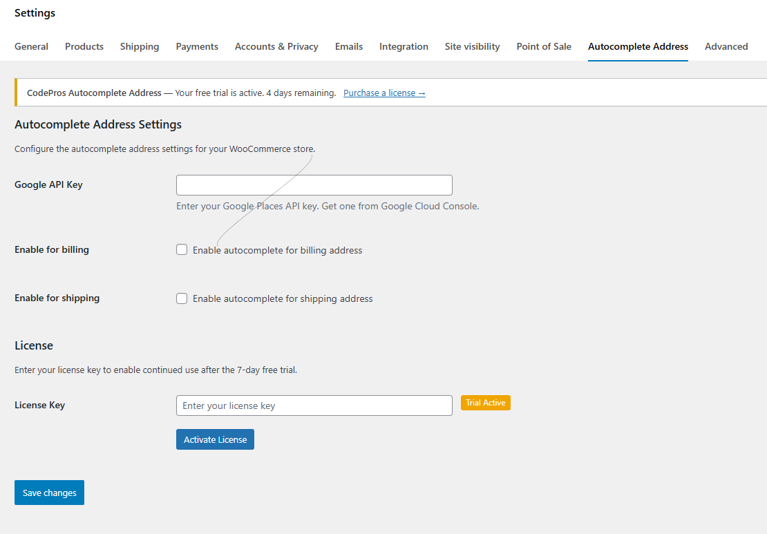 - Go to WooCommerce > Settings > Autocomplete Address to configure the plugin