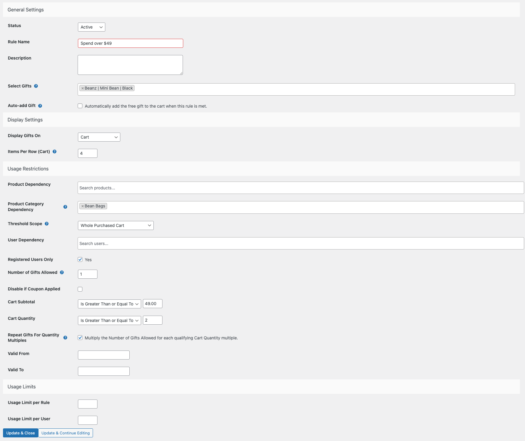 * Usage Limit per User (Limits how many times an individual user can use the gift rule)