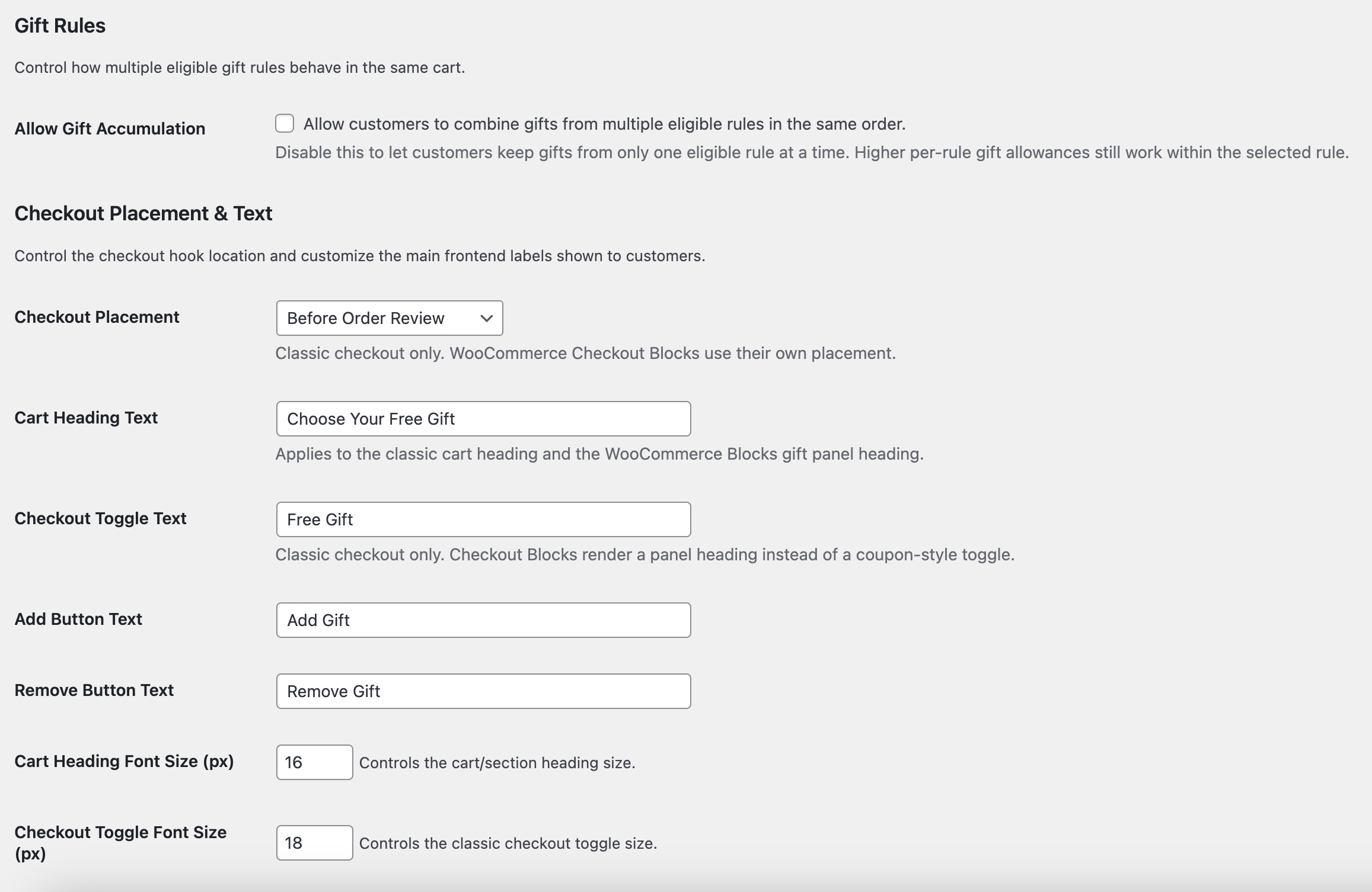 - [Added] Checkout placement setting for classic WooCommerce checkout, plus customizable cart/checkout gift labels and button/heading font sizes from the plugin settings page.