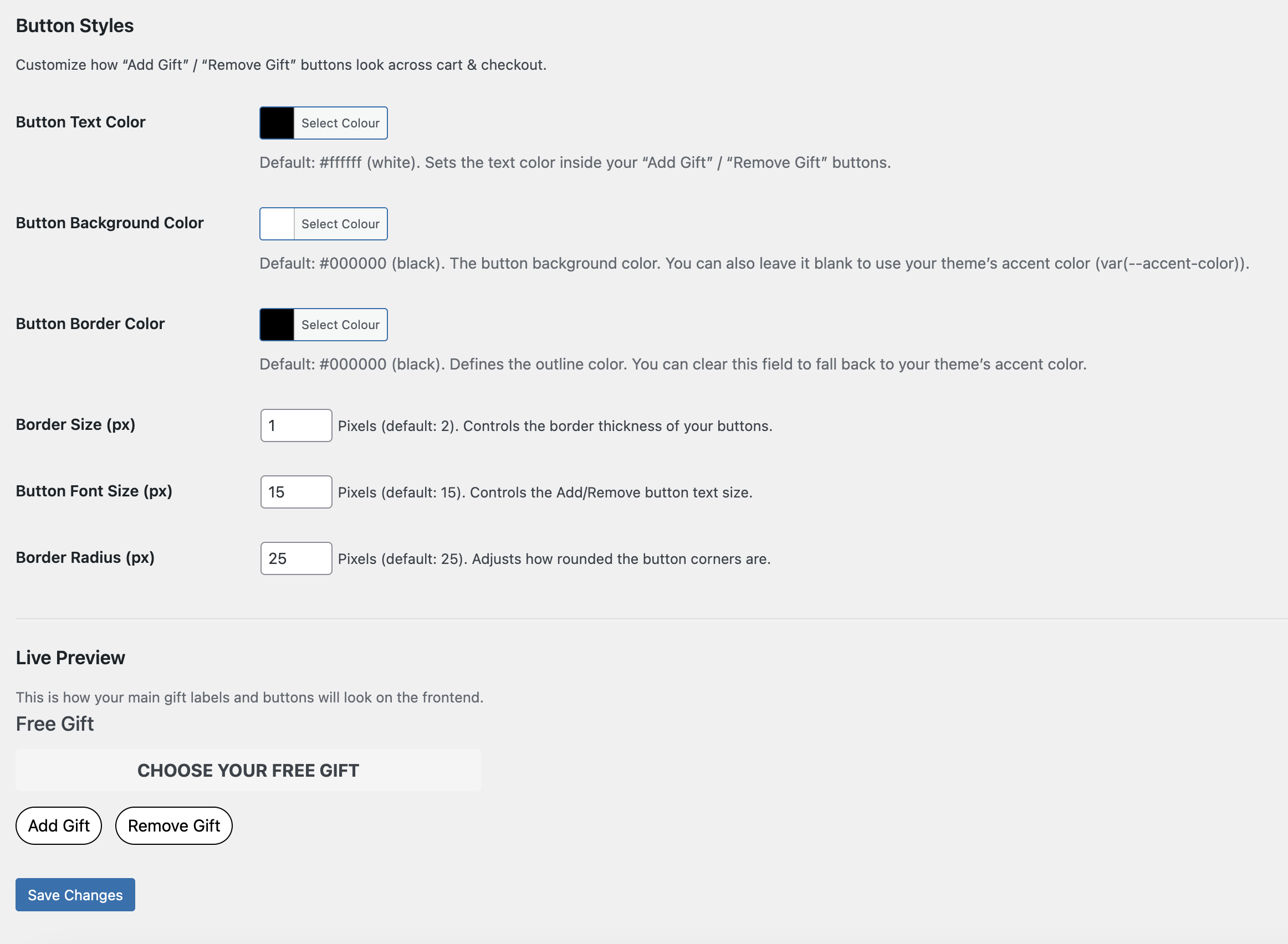 - ✍️ Custom Gift Text & Sizing — change main gift labels and control button/heading font sizes without editing code.